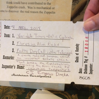 What a gathering there was to help find out what brought down the zeppelin! So many investigators stopped by to see what they could find in the debris that was pulled from the wreckage. Check out the tags with all the different ways it could have happened...